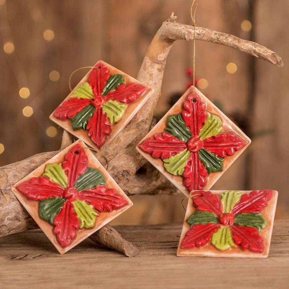 Red and Green Ceramic Azalea Ornaments Set of 4 'Christmas Azaleas' Item ID: 2671776698