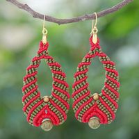 Red and Green Macrame Dangle Earrings with Unakite and Brass 'Beaded Cocoons' Item ID: 2671800230