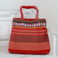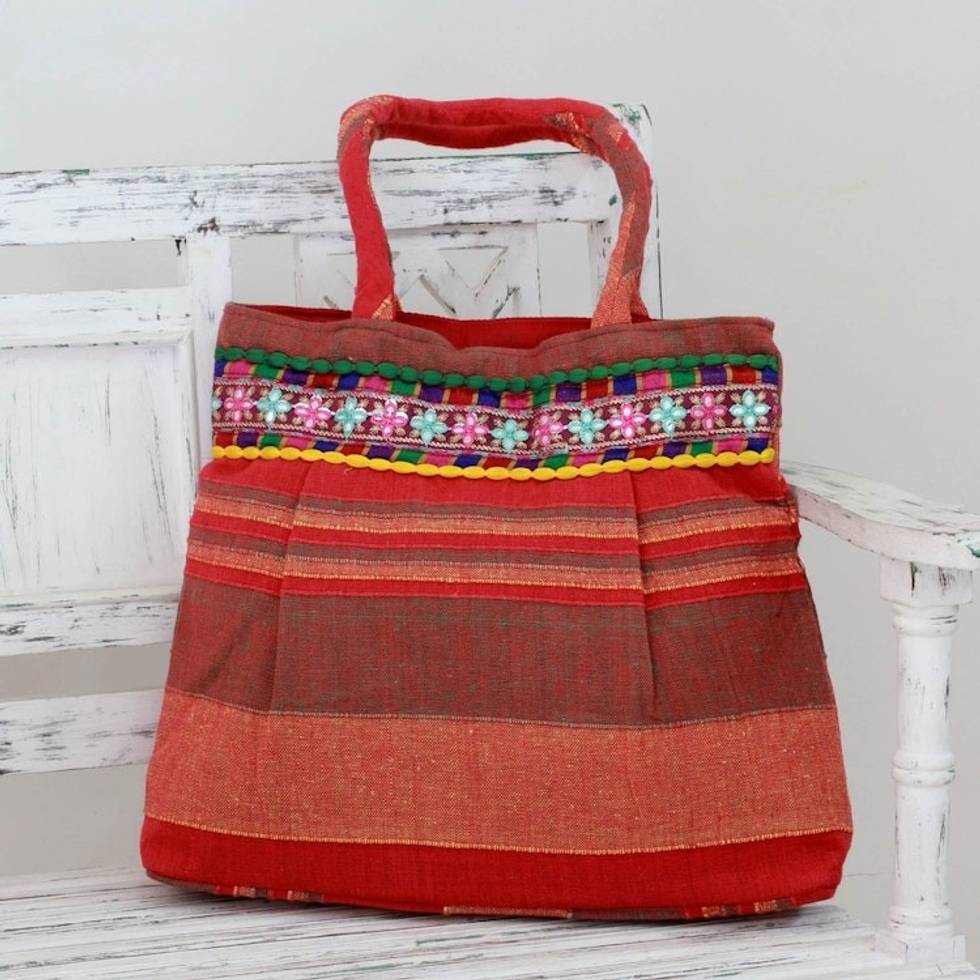 Red and Orange Striped Cotton Shoulder Bag from India 'Scarlet Dawn' Item ID: 2671793718