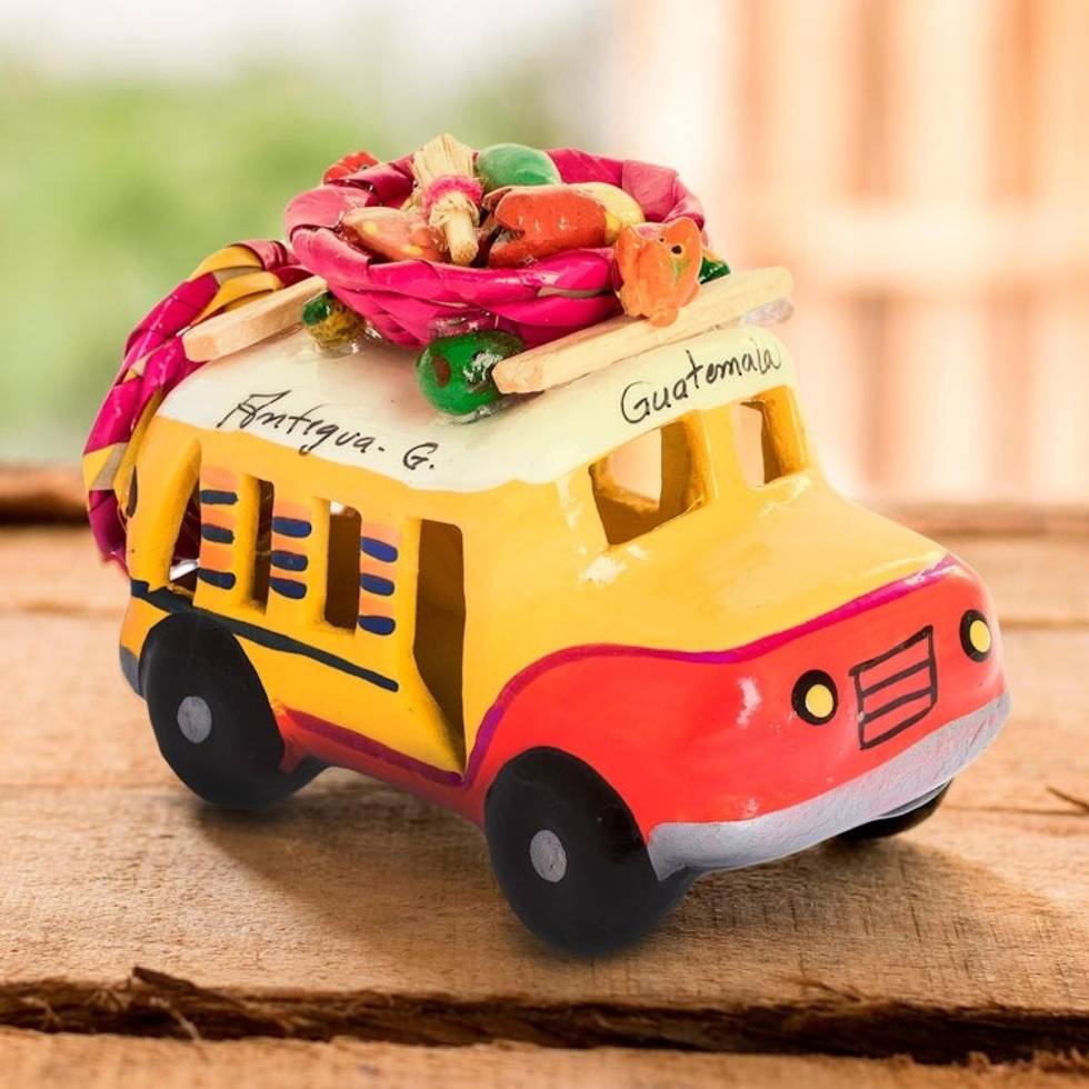 Red and Yellow Ceramic Bus Sculpture from Guatemala 'Red and Yellow Old Time Bus' Item ID: 2671771850