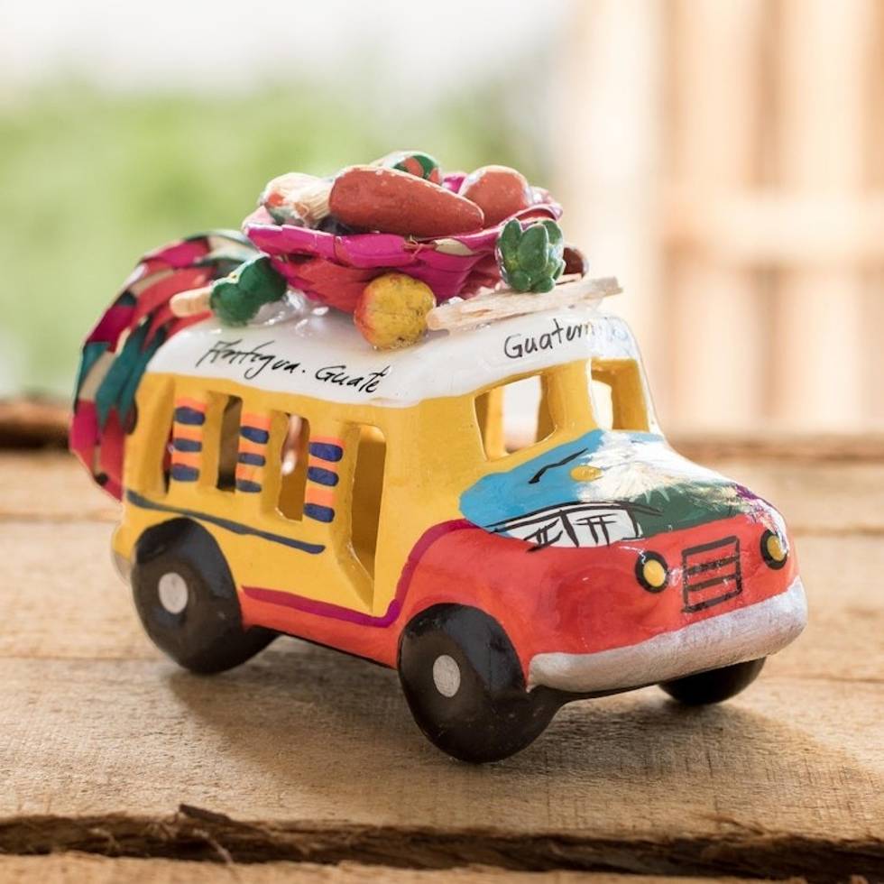 Red and Yellow Ceramic Mini Bus Figurine from Guatemala 'Red and Yellow Old Time Bus' Item ID: 2671772518