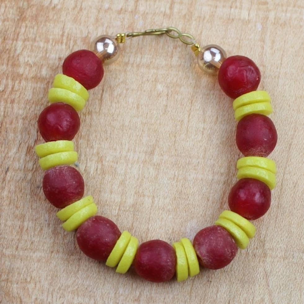 Red and Yellow Striped Recycled Glass Beaded Bracelet 'Frosty Berries' Item ID: 2671803735