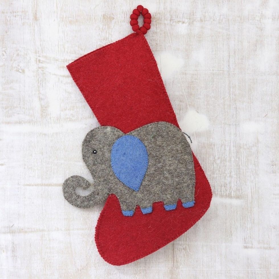 Red Elephant Motif Christmas Stocking from India 'Holiday Elephant in Grey' Item ID: 2671792993