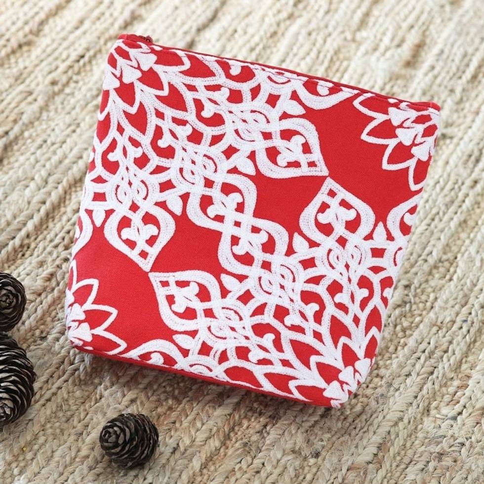 Red Embroidered Cotton Cosmetic Bag from India 'Candy Apple' Item ID: 2671789718