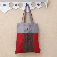 "While this red and grey tote bag is spacious enough for carrying your shopping bags or your travel essentials, it can also be folded to the size of a clutch bag for storage purposes. Practical reasons aside, the bag hand-woven from cotton by the Lawe Lurik Community in Java is very fashionable thanks to the contrasting colors and the classic Indonesian lurik striped pattern on the exterior pocket, which comes with a button closure that allows for folding."