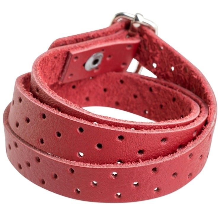 "Rebeca Zamora of Costa Rica crafts recycled leather into this bold and colorful wrap bracelet. Crimson in color, the bracelet closes with a stainless steel buckle. Small holes along the band add texture to the design."