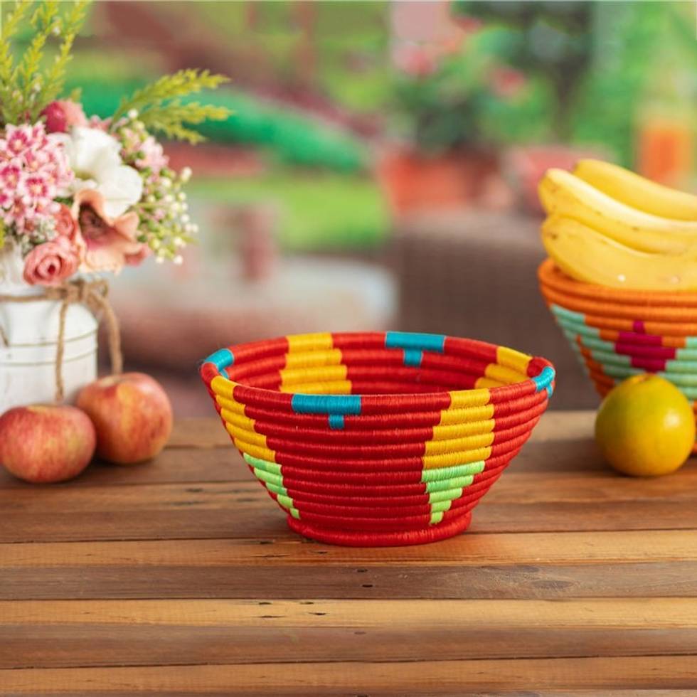 Red Natural Fiber Decorative Bowl with Geometric Motifs 'Guacamayas Summer' Item ID: 2671400817