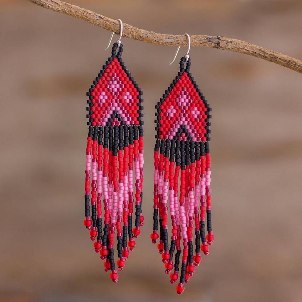 Red, Pink and Black Woven Bead Waterfall Earrings 'Peaks and Valleys in Red' Item ID: 2671779325