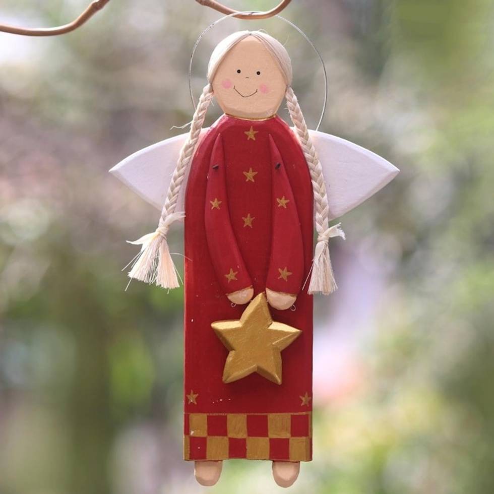Red Wood Angel with a Star in Holiday Decor from Bali 'Star Angel in Red' Item ID: 2671737524