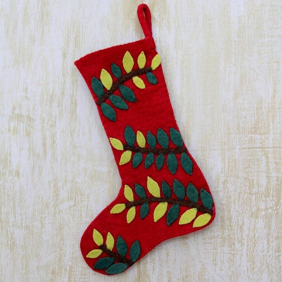 Red Wool Felt Christmas Stocking with Leafy Vine Applique 'Jungle Christmas' Item ID: 2671793063