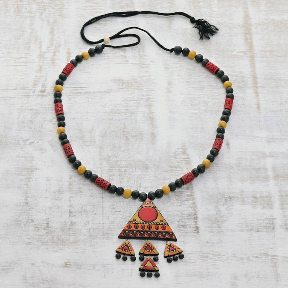 Red, Yellow Black Triangle Pendant Beaded Cord Necklace 'Dancing Pyramid' Item ID: 2671791753