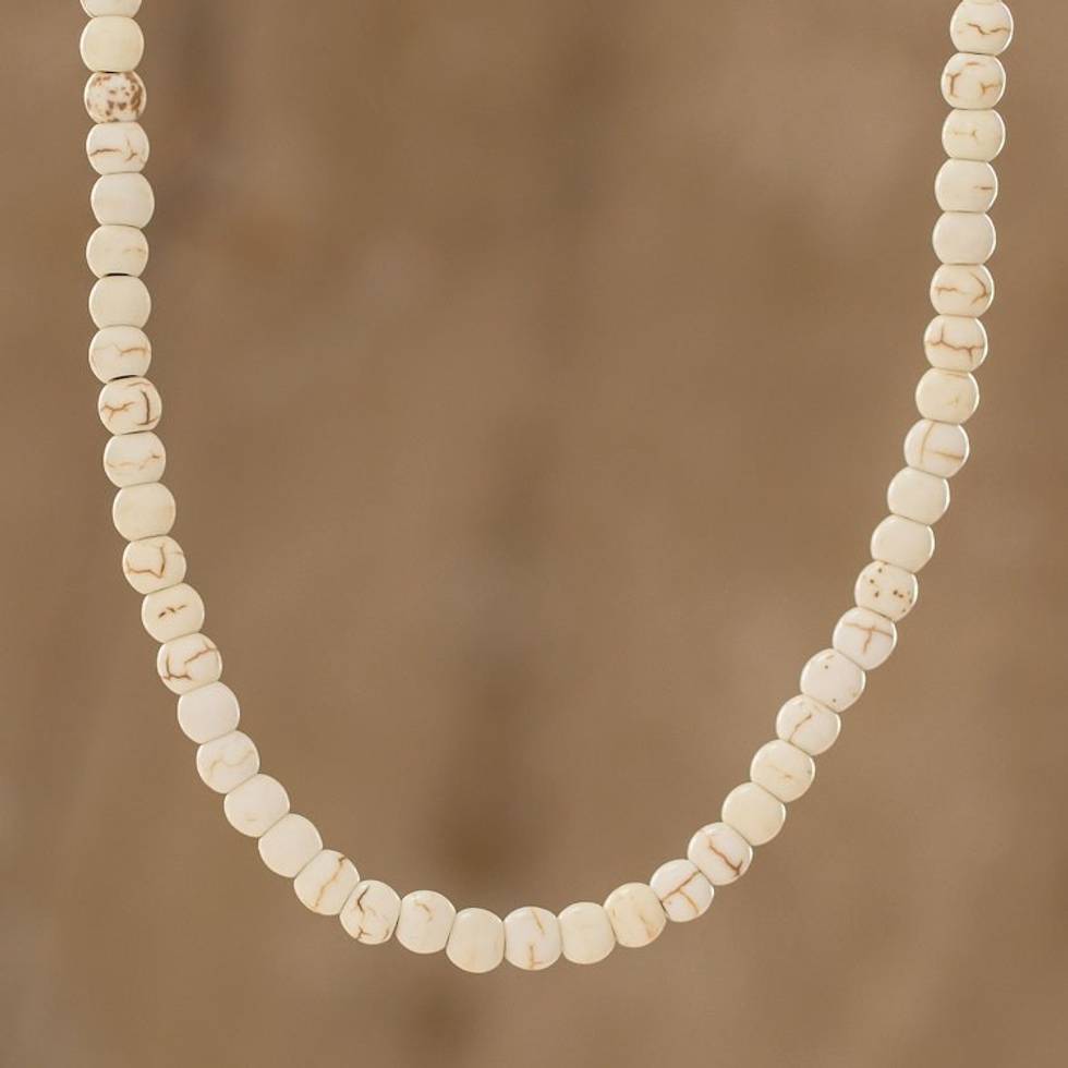 "The off-white beads of this bohemian style necklace evoke vintage ivory with its crackling pattern. They are accented by beads of brown and green jasper on this handsome necklace by Guatemala's Lorena Cofino."