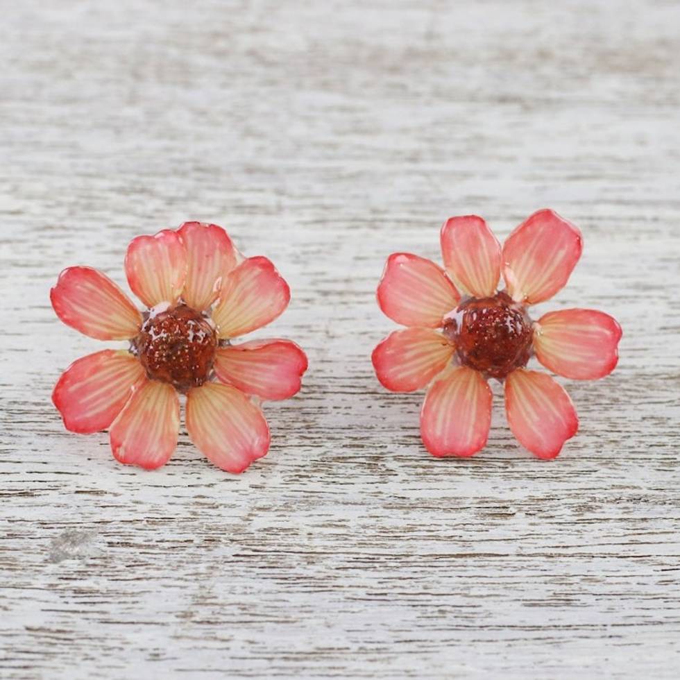Resin Coated Natural Zinnia Button Earrings from Thailand 'Red Summertime Zinnia' Item ID: 2669927438