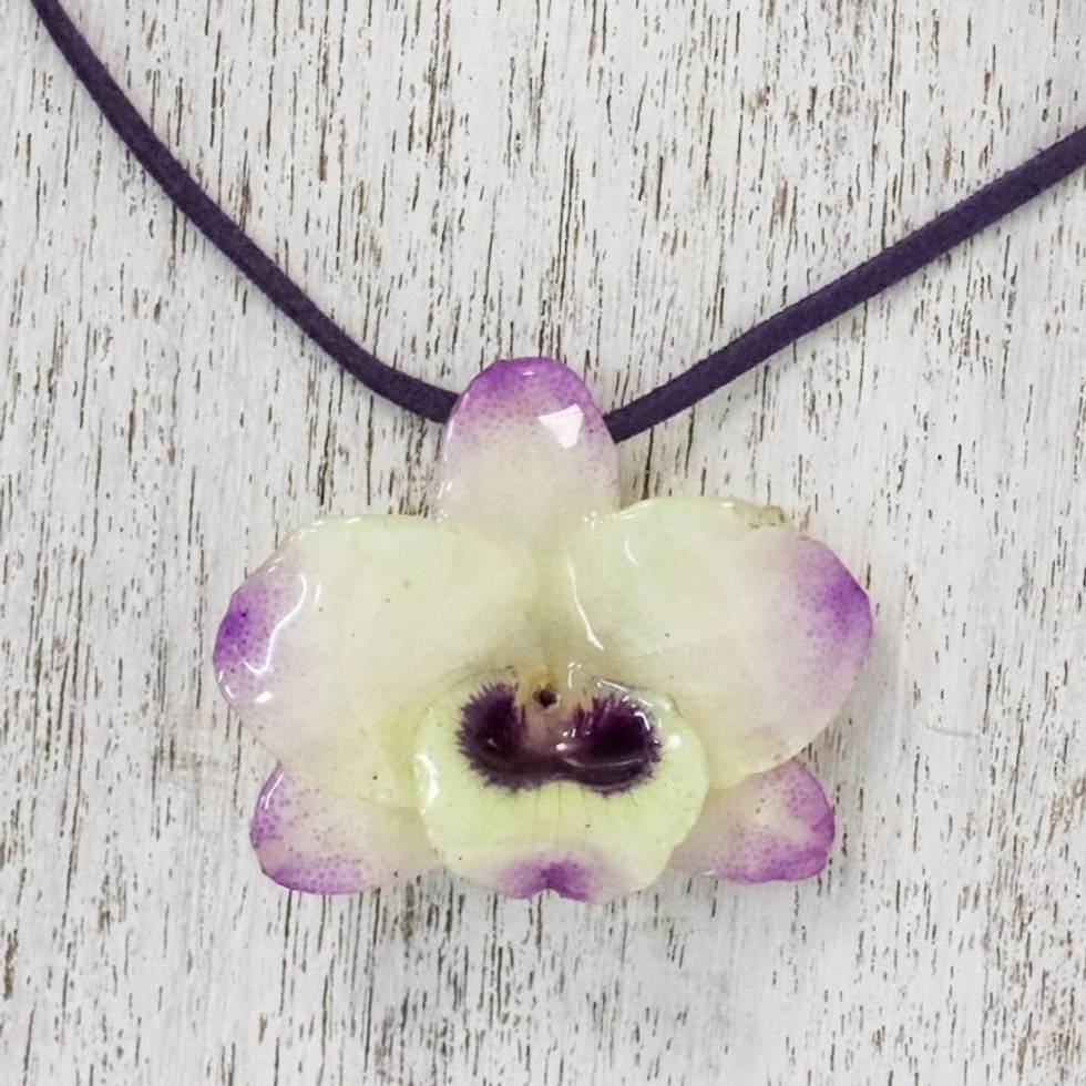 Resin-Coated Pale Yellow and Purple Orchid Pendant Necklace 'Orchid Treasure' Item ID: 2671641316