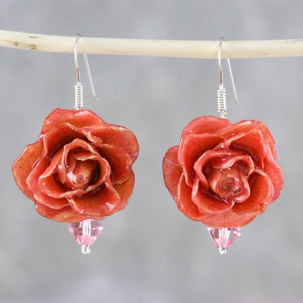 Resin Dipped Pink Real Miniature Rose Dangle Earrings 'Captured Beauty in Pink' Item ID: 2671798517