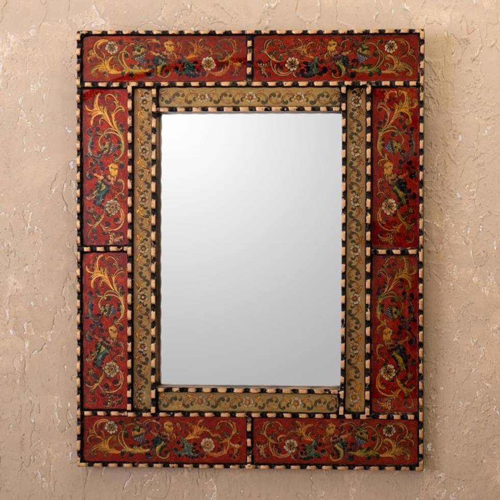 Reverse Painted Glass and Wood Framed Wall Mirror from Peru 'Red Peruvian Elegance' Item ID: 2671820306