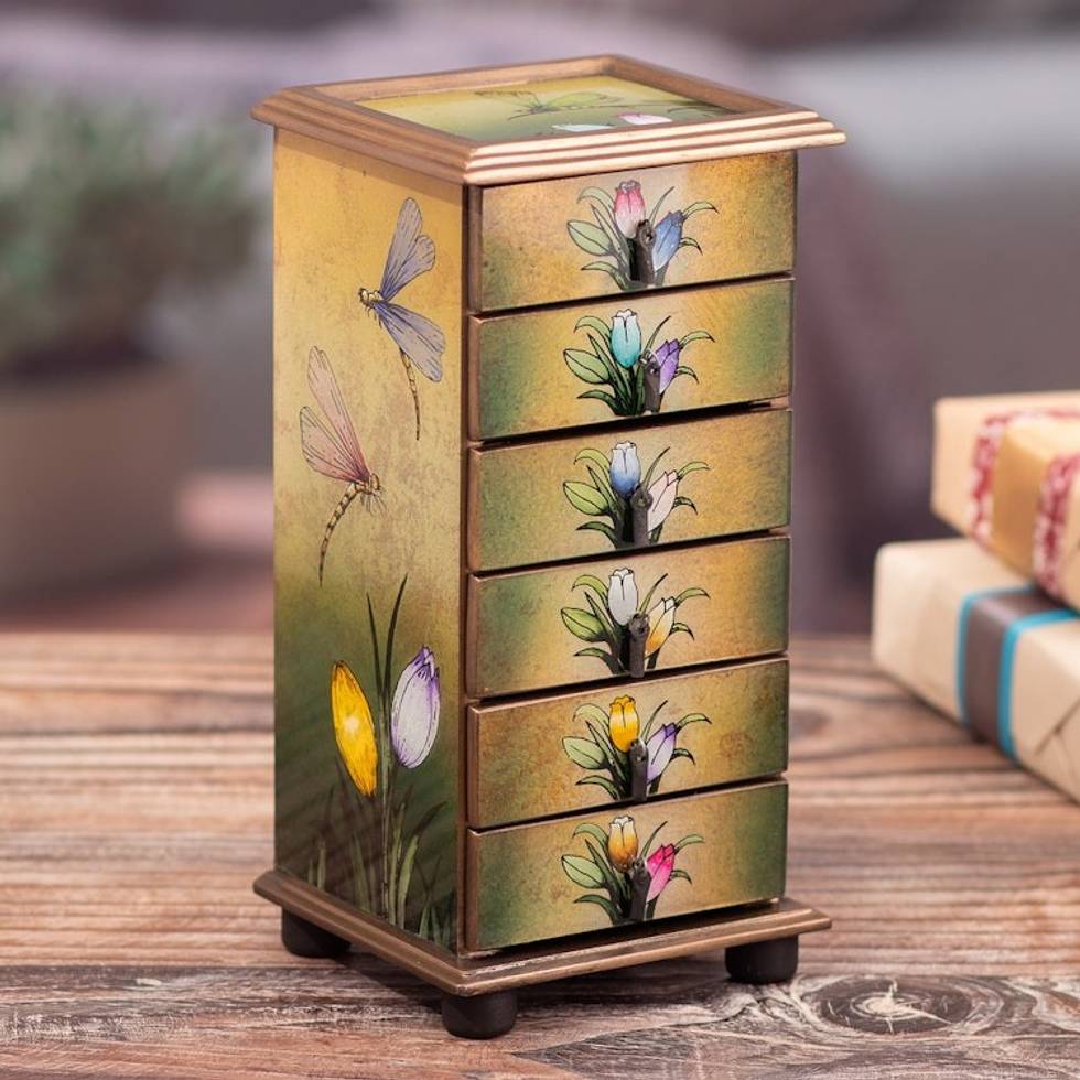 This jewelry chest is very unusual, very striking and just beautiful. I collect boxes and this is now my favorite box ever. I very much enjoy and love everything I have purchased from Asunta Pelaez and I thank her for this box.