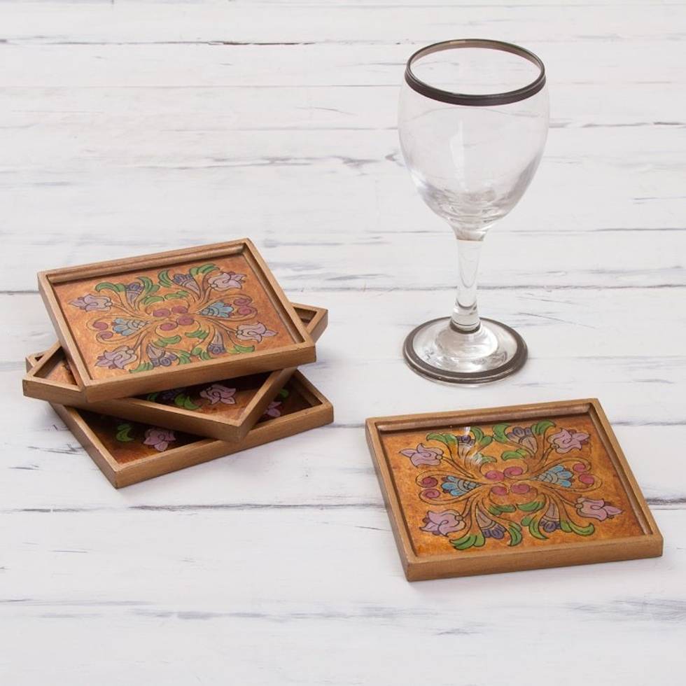 Reverse Painted Glass Floral Coasters from Peru Set of 4 'Floral Gold' Item ID: 2669904190