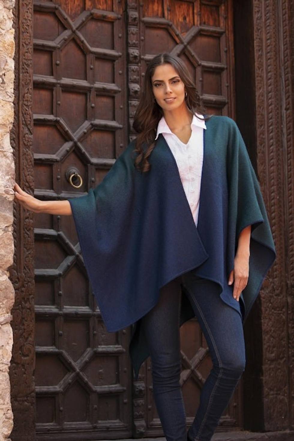 Beautifully made alpaca blend ruana. Perfect weight and so much attention to detail in its creation. Worn with jeans or skirts, it is the perfect addition.Gifted this to a dear friend who wears it constantly! Also ordered one for myself! Stunning!