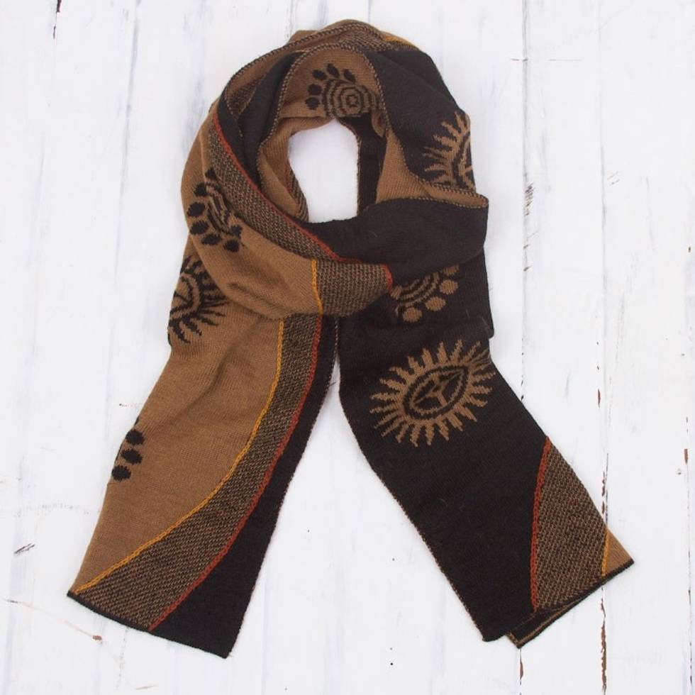 Reversible Sepia and Black Sun Motif Alpaca Blend Scarf 'Sepia and Black Cosmovision' Item ID: 2669891437