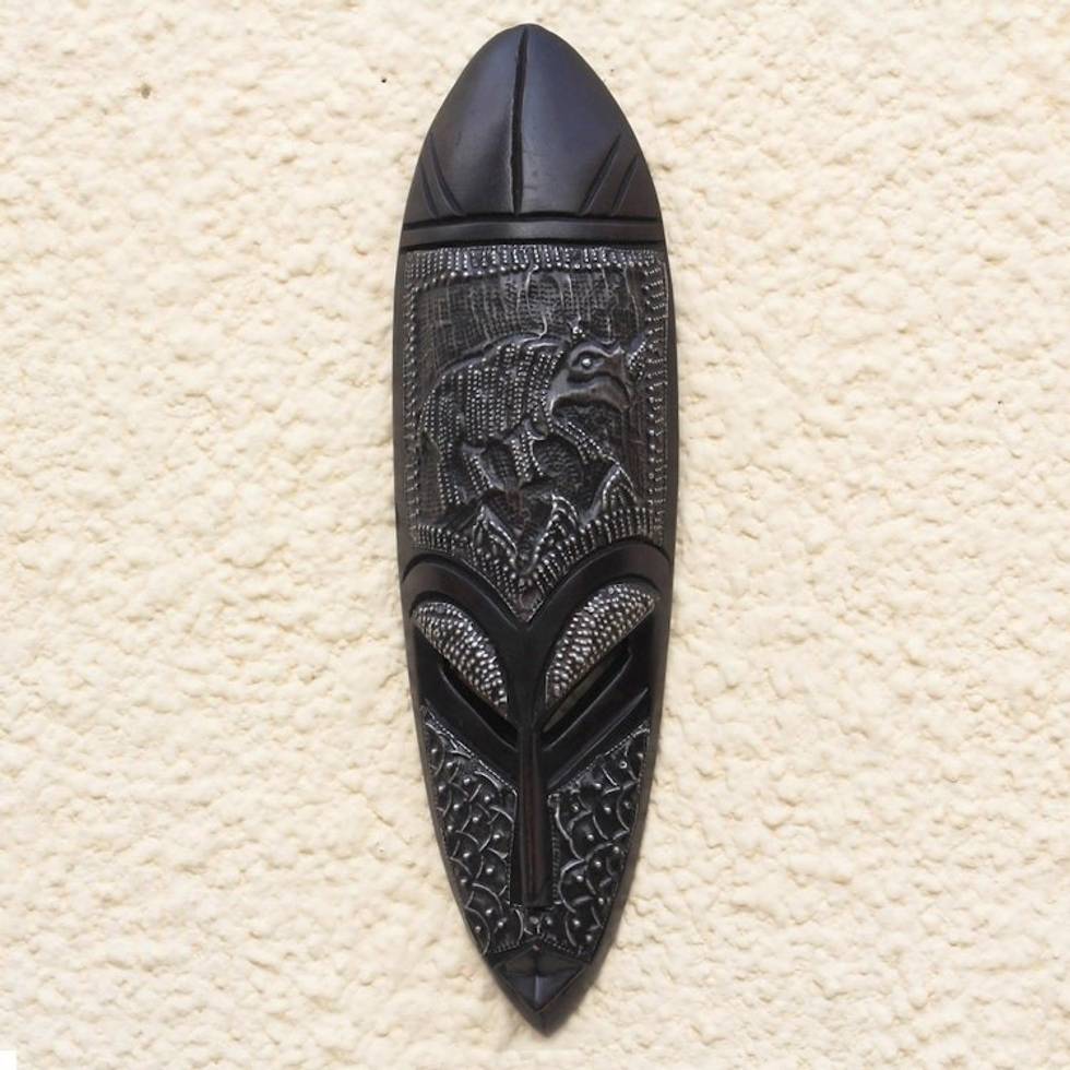 Rhino-Themed African Sese Wood and Aluminum Mask from Ghana 'Dark Lobi' Item ID: 2671805676
