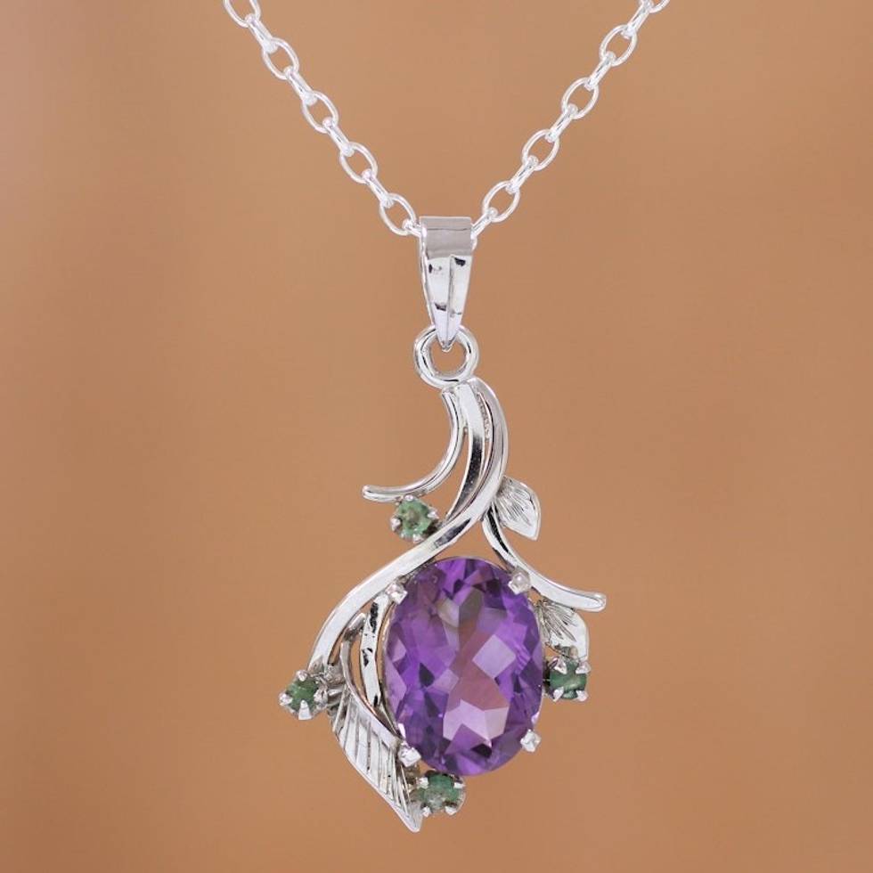 Rhodium Plated Amethyst and Emerald Necklace from India 'Harmony Vine' Item ID: 2669925390