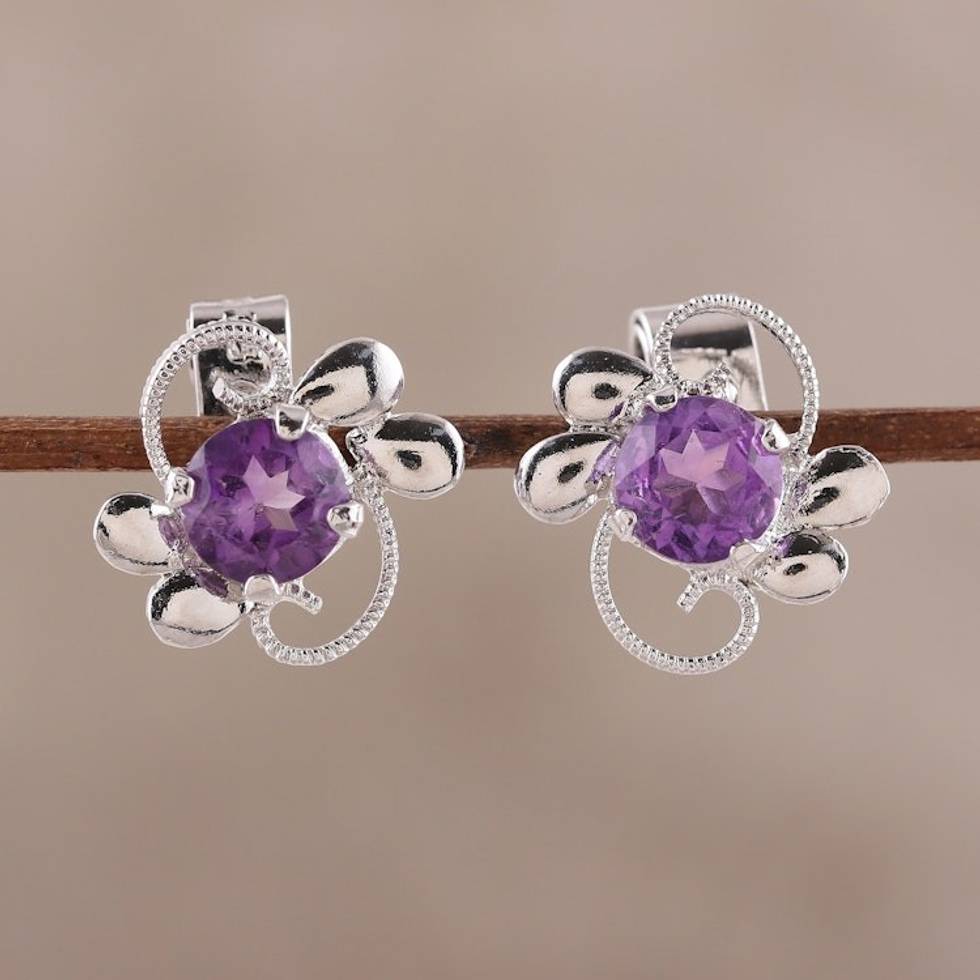 Rhodium Plated Amethyst Stud Earrings from India 'Glittering Purple Charm' Item ID: 2669924418