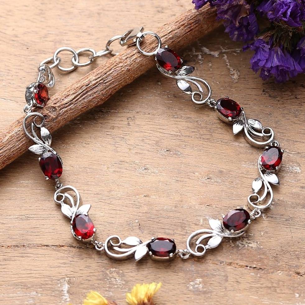 Rhodium-Plated and Eight-Carat Natural Garnet Link Bracelet 'Scarlet Shimmer' Item ID: 2671623021