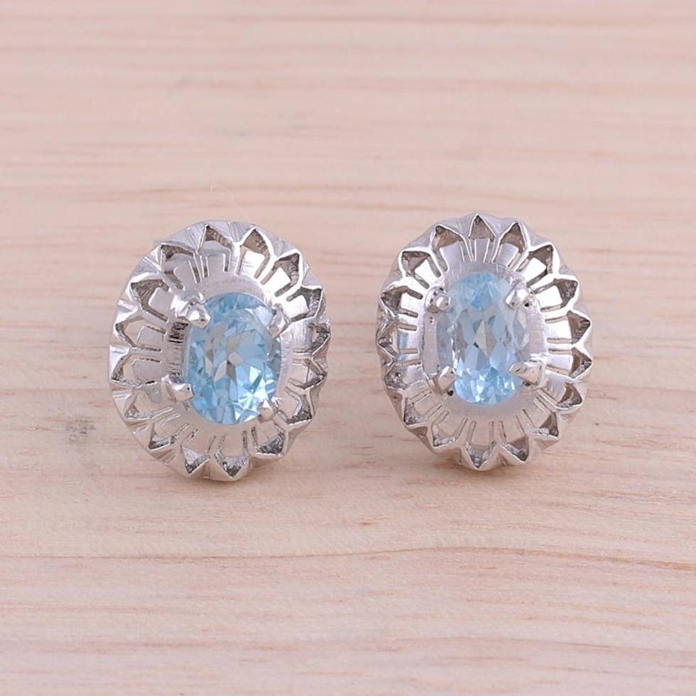 Rhodium Plated Blue Topaz Button Earrings from India 'Radiant Rays' Item ID: 2671790409
