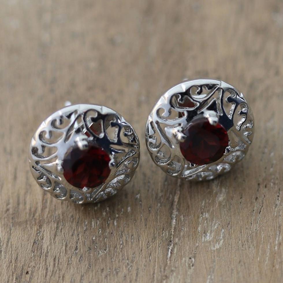 Rhodium-Plated Button Earrings with Garnet Stones 'Perseverance Swirls' Item ID: 2671786526