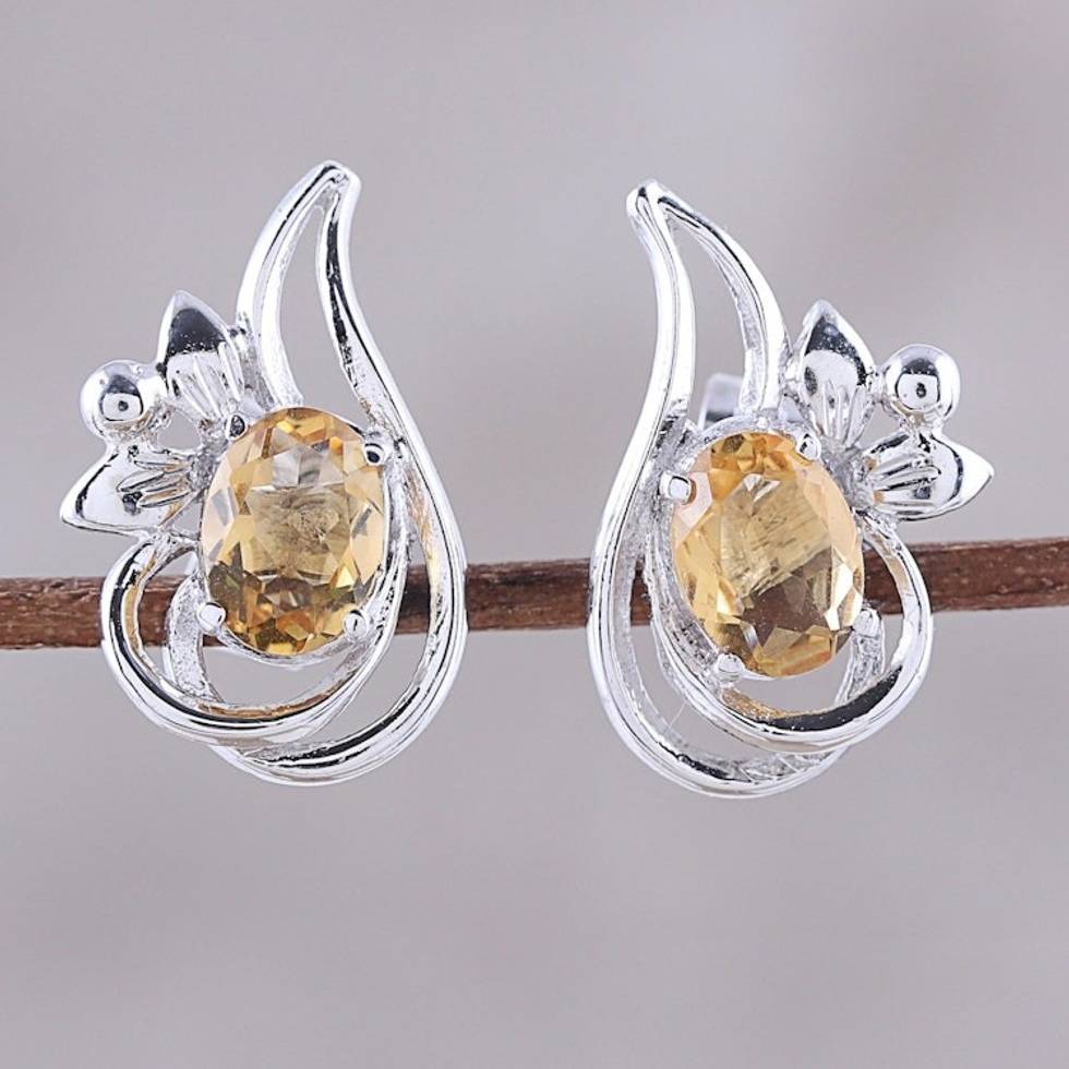 Rhodium Plated Citrine Paisley Button Earrings from India 'Classic Paisley' Item ID: 2671792655