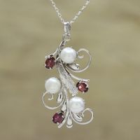 Rhodium Plated Cultured Pearl and Garnet Necklace from India 'Royal Vine' Item ID: 2671791681