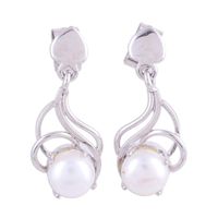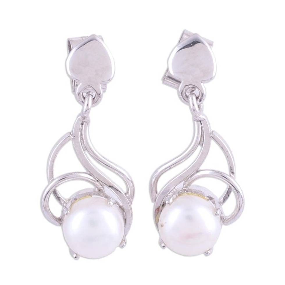 Rhodium Plated Cultured Pearl Dangle Earrings from India 'Graceful Purity' Item ID: 2671790728