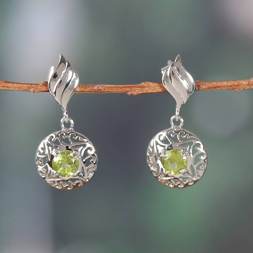 Rhodium-Plated Dangle Earrings with One-Carat Peridot Gems 'Green Swirl' Item ID: 2671782385