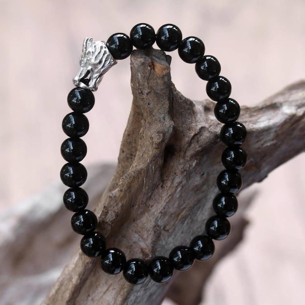 Rhodium Plated Dragon Onyx Beaded Stretch Bracelet 'Tranquil Dragon' Item ID: 2671737842