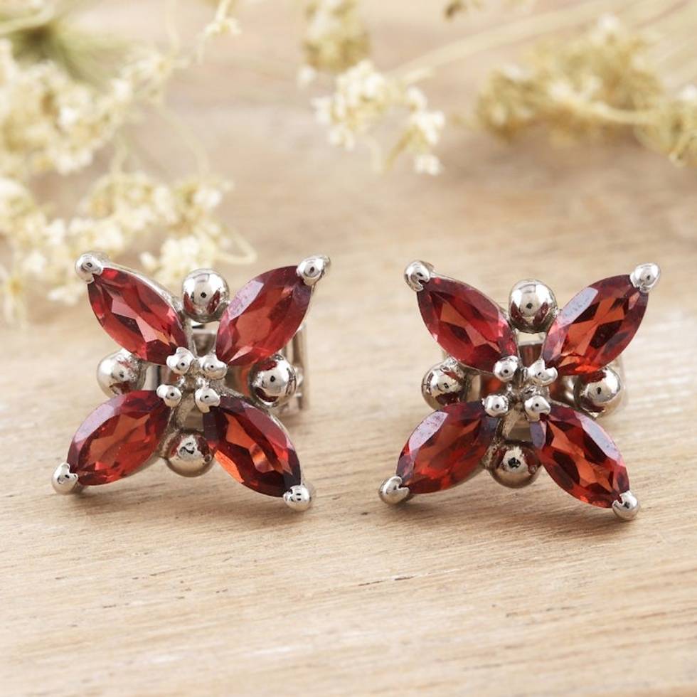 Rhodium-Plated Garnet Floral-Motif Button Earrings 'Red Petals' Item ID: 2671787309