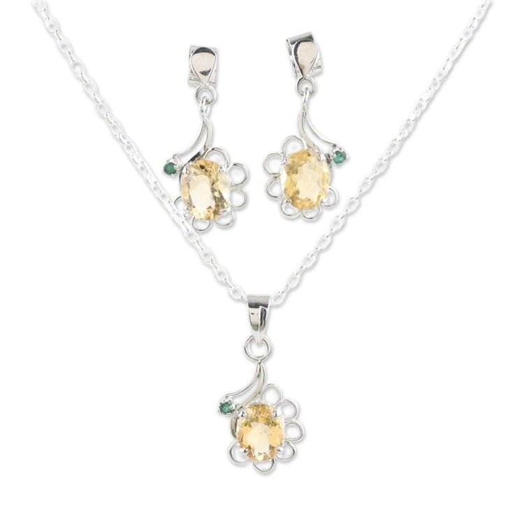 Rhodium-plated Jewelry Set with 9-Carat Citrine and Emerald 'Tender Garden' Item ID: 2671786778