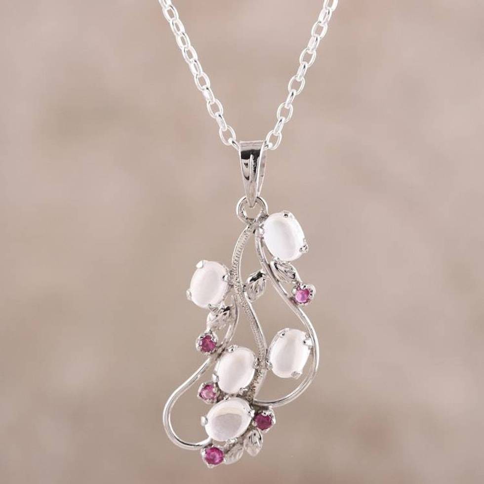 Rhodium Plated Moonstone and Ruby Pendant Necklace 'Elegant Radiance' Item ID: 2676664408