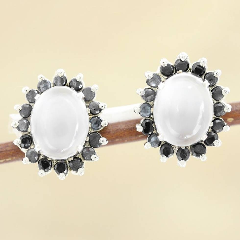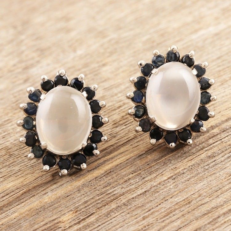 Rhodium-Plated Moonstone and Sapphire Button Earrings 'Midnight Joy' Item ID: 2671788751