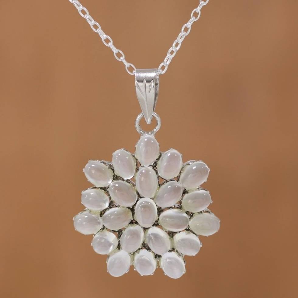 Rhodium Plated Moonstone Floral Pendant Necklace from India 'Moonlight Brilliance' Item ID: 2671791795