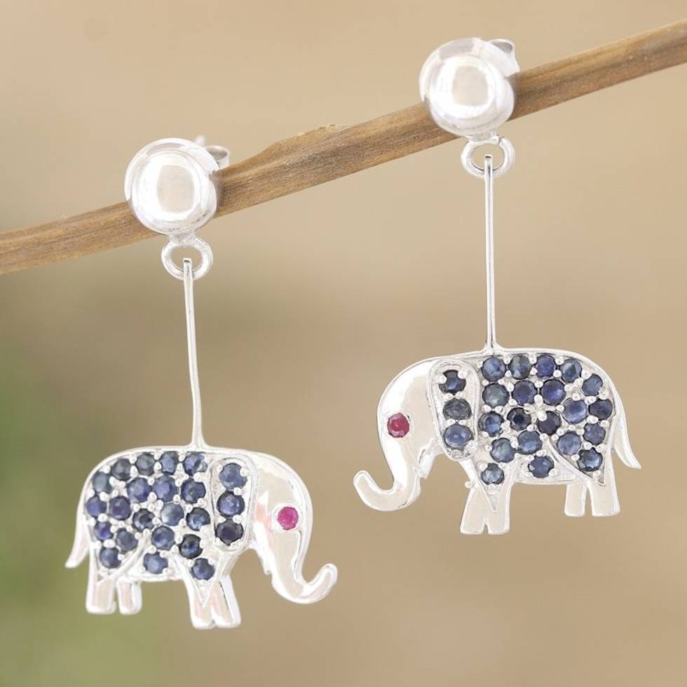 Rhodium-Plated Sapphire and Ruby Elephant Earrings 'Generous Fortune' Item ID: 2671789188