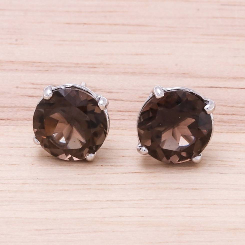 Rhodium Plated Smoky Quartz Stud Earrings from Thailand 'Precious Sparkle' Item ID: 2669926702