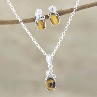 Rhodium-Plated Tiger's Eye and Cubic Zirconia Jewelry Set 'Peppy in Brown' Item ID: 2671789120