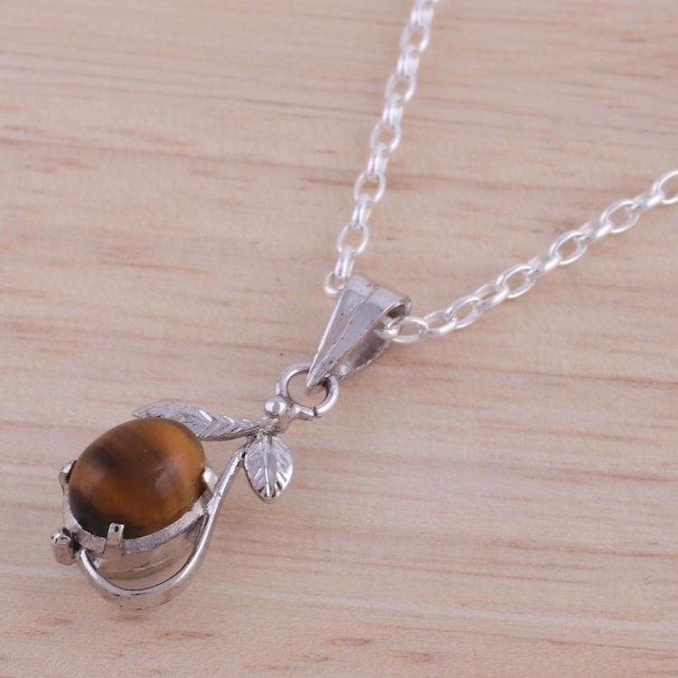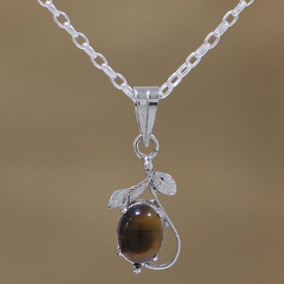 Rhodium Plated Tiger's Eye Leaf Necklace from India 'Forest Earth' Item ID: 2671791328