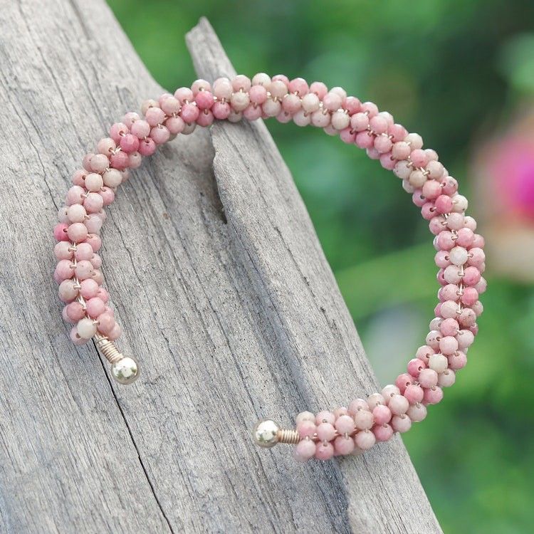 Rhodochrosite Brass and Copper Wire Beaded Cuff Bracelet 'Dainty Beauty' Item ID: 2671797053