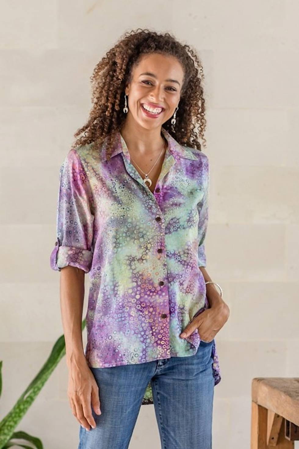 Roll-Tab Sleeve Button Front Batik Rayon Blouse 'Rainbow Bubbles' Item ID: 2669891918