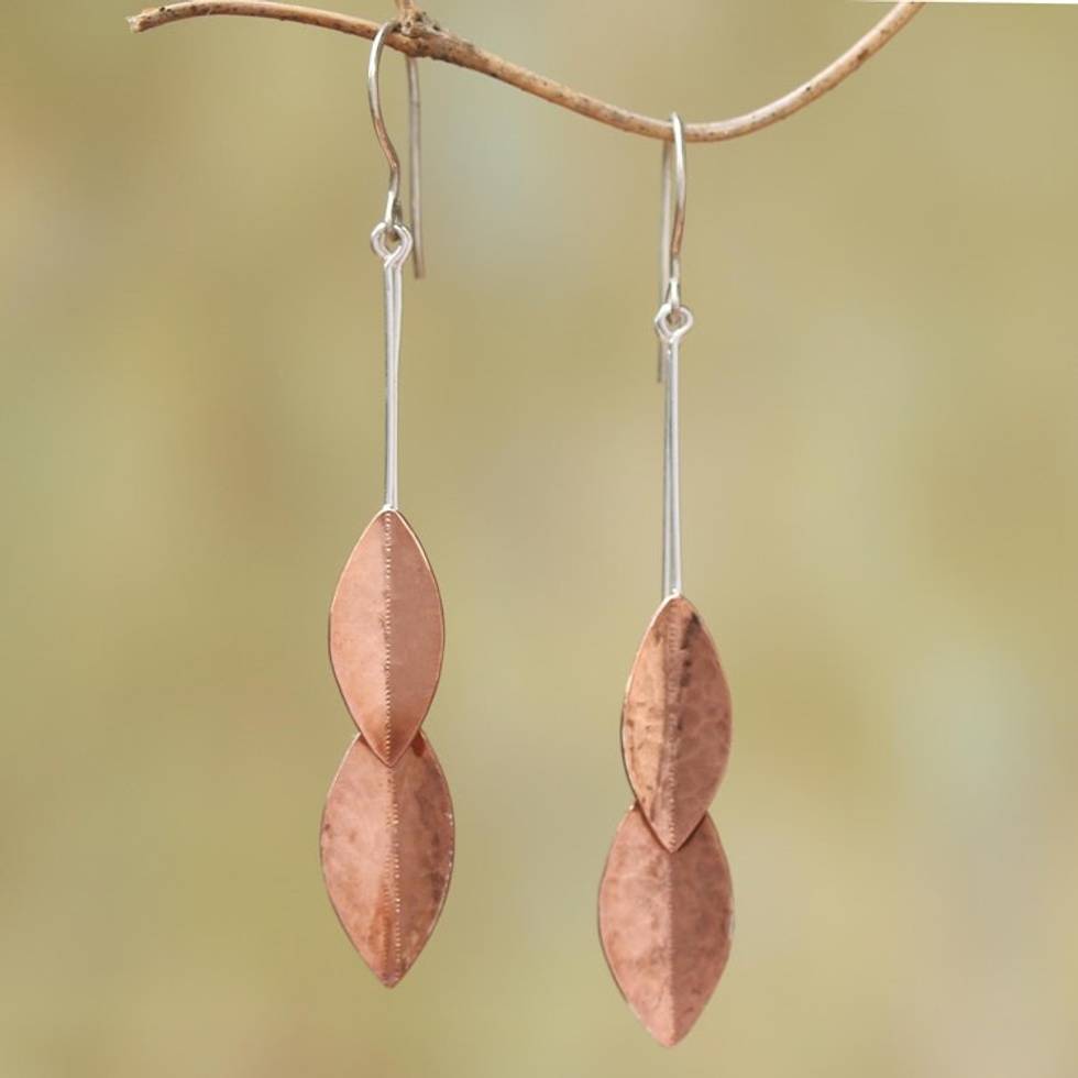 Rose Gold Accent Sterling Silver Leaf Dangle Earrings 'Feminine Leaves' Item ID: 2669922077