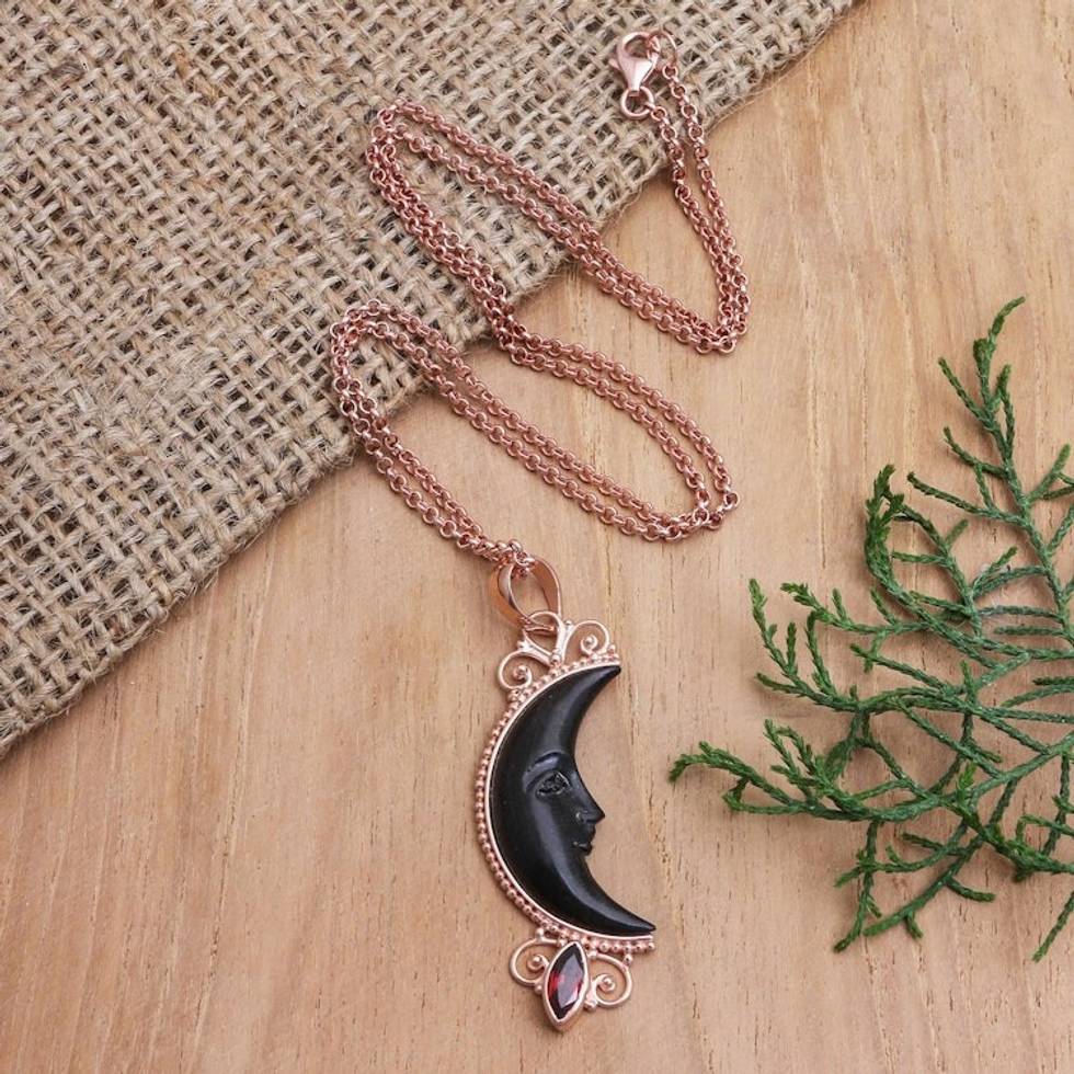 Rose Gold-Plated Garnet Pendant Necklace 'Moonlit Shadow' Item ID: 2671747444