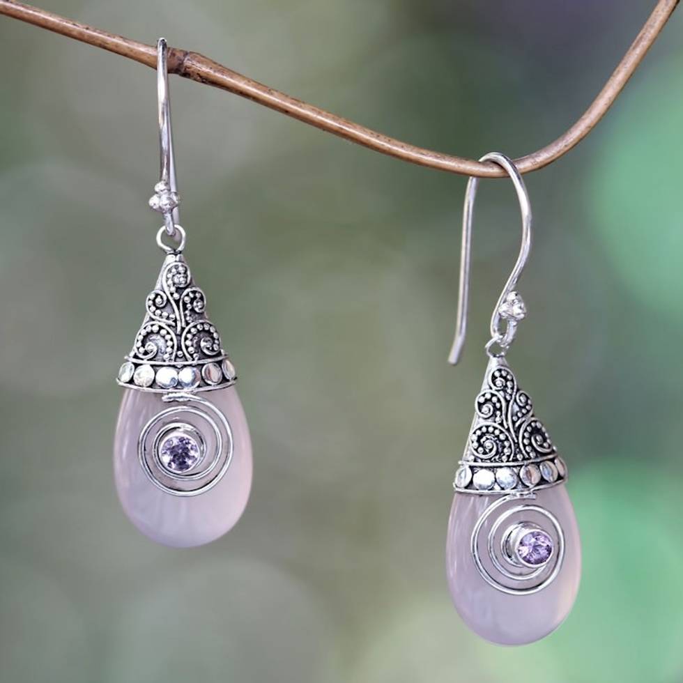 Rose Quartz and Amethyst Sterling Silver Dangle Earrings 'Mount Bromo Dawn' Item ID: 2671702482