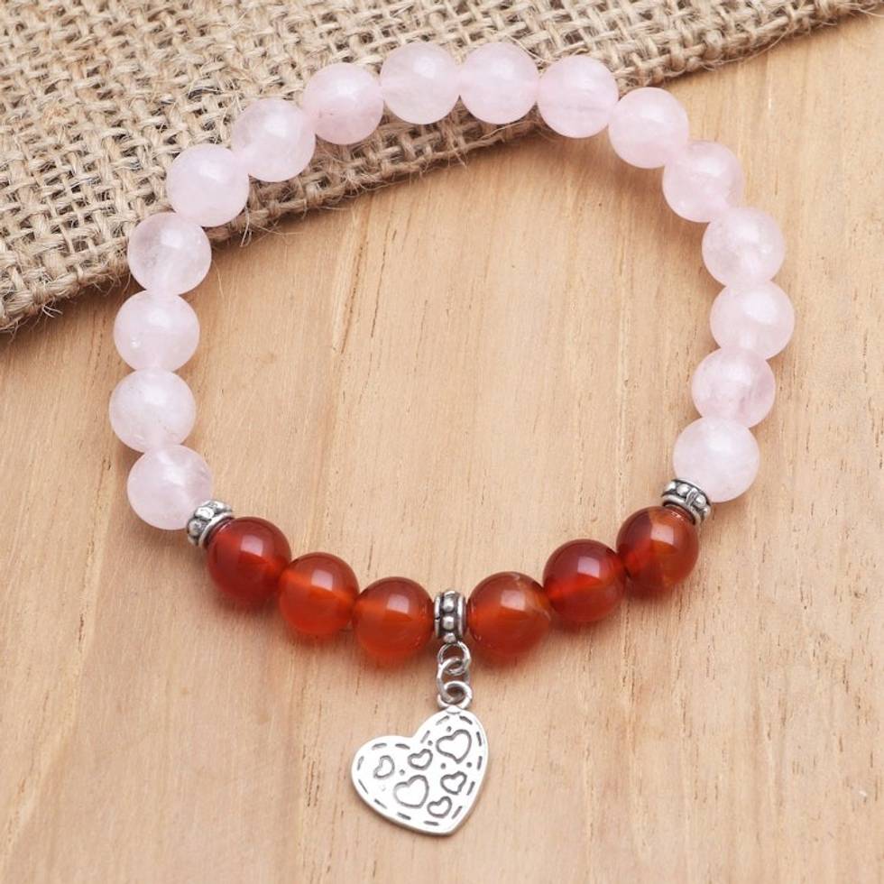 Rose Quartz and Carnelian Heart-Motif Charm Bracelet 'Loving Mood' Item ID: 2671745105
